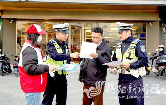 惠来县交通秩序工作专班向群众发放交通安全宣传资料,倡导文明出行新风。方宇森 摄